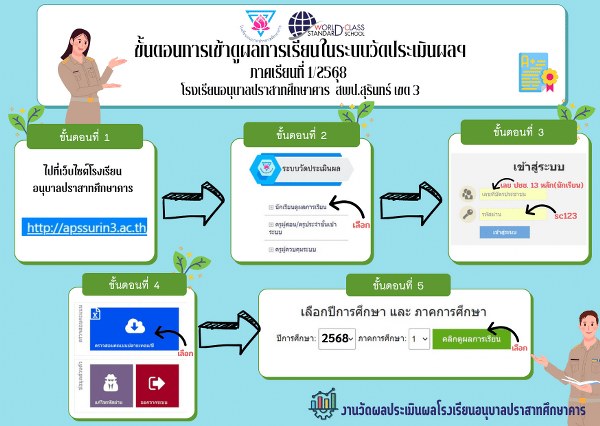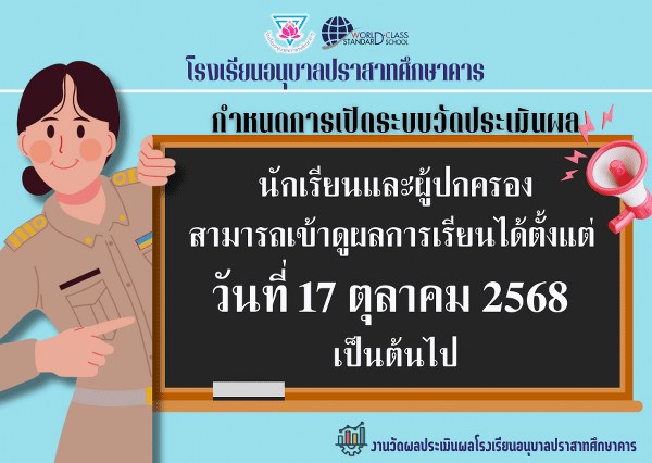 ตั้งแต่วันที่ 17 ตุลาคม พ.ศ.2568 นักเรียนและผู้ปกครองสามารถเข้าตรวจสอบผลการเรียนของนักเรียน ในภาคเรียนที่ 1/2568 ได้แล้วนะคะ ***เลข ปชช. นักเรียน 13 หลัก และรหัสผ่าน sc123*** หรือมีปัญหาไม่สามารถเข้าดูได้เนื่องจากเปลี่ยนรหัสผ่านแล้วลืม ติดต่อคุณครูประจำชั้น ได้เลยนะคะ ขอบคุณค่ะ งานวัดและประเมินผลโรงเรียนอนุบาลปราสาทศึกษาคาร
